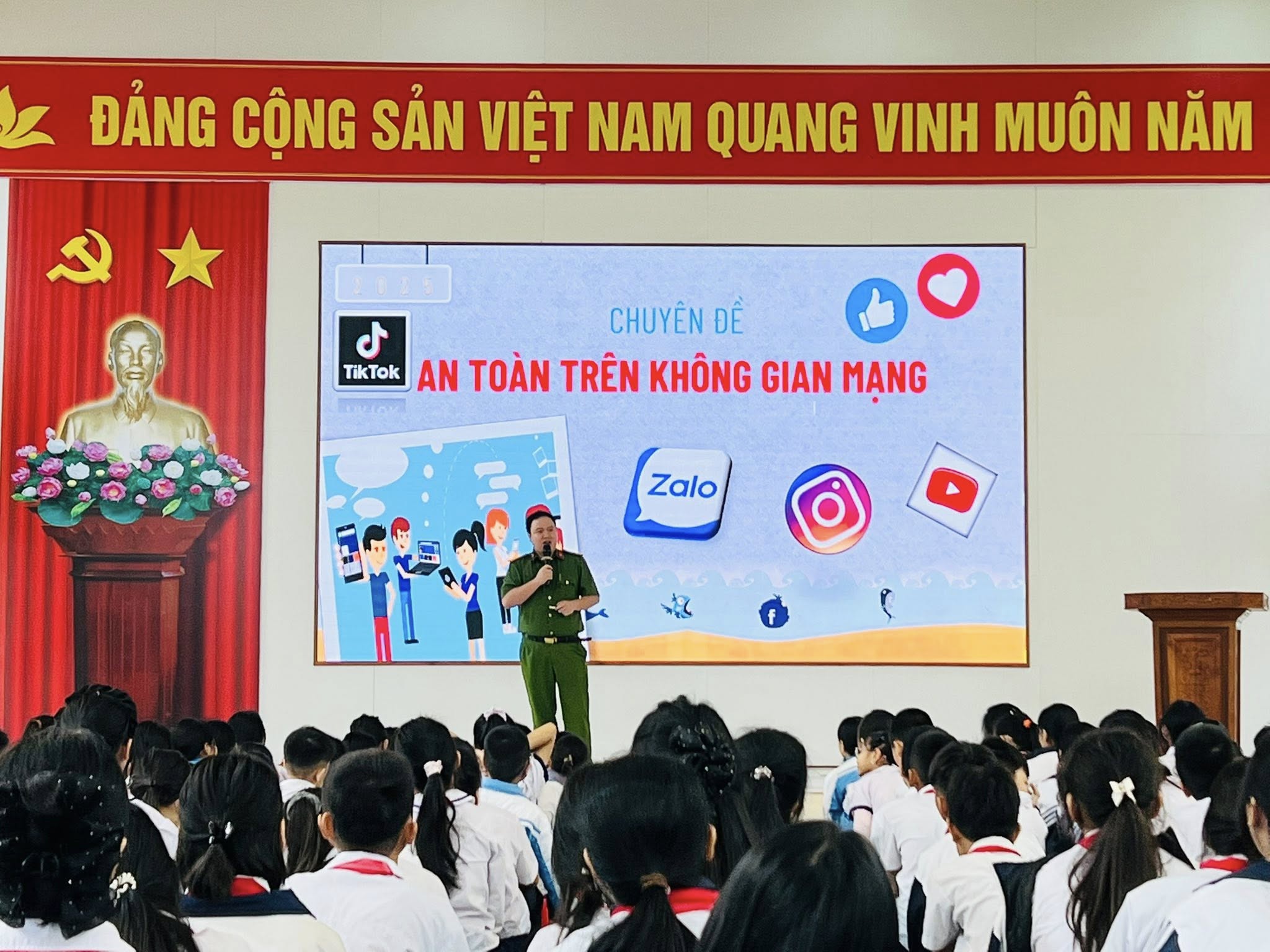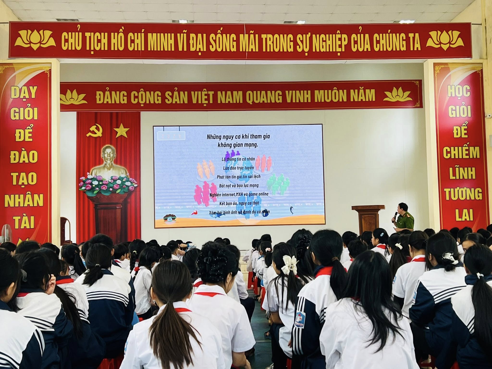 Với chuyên đề kỹ năng an toàn trên không gian mạng, đ/c Đại uý Bùi Tiến Tùng - Cán bộ Công an xã An Hưng đã truyền đạt những nguy cơ khi tham gia không gian mạng và những biện pháp phòng tránh những rắc rối khi sử dụng; giúp học sinh có kỹ năng bảo mật thông tin và sử dụng mạng xã hội an toàn.