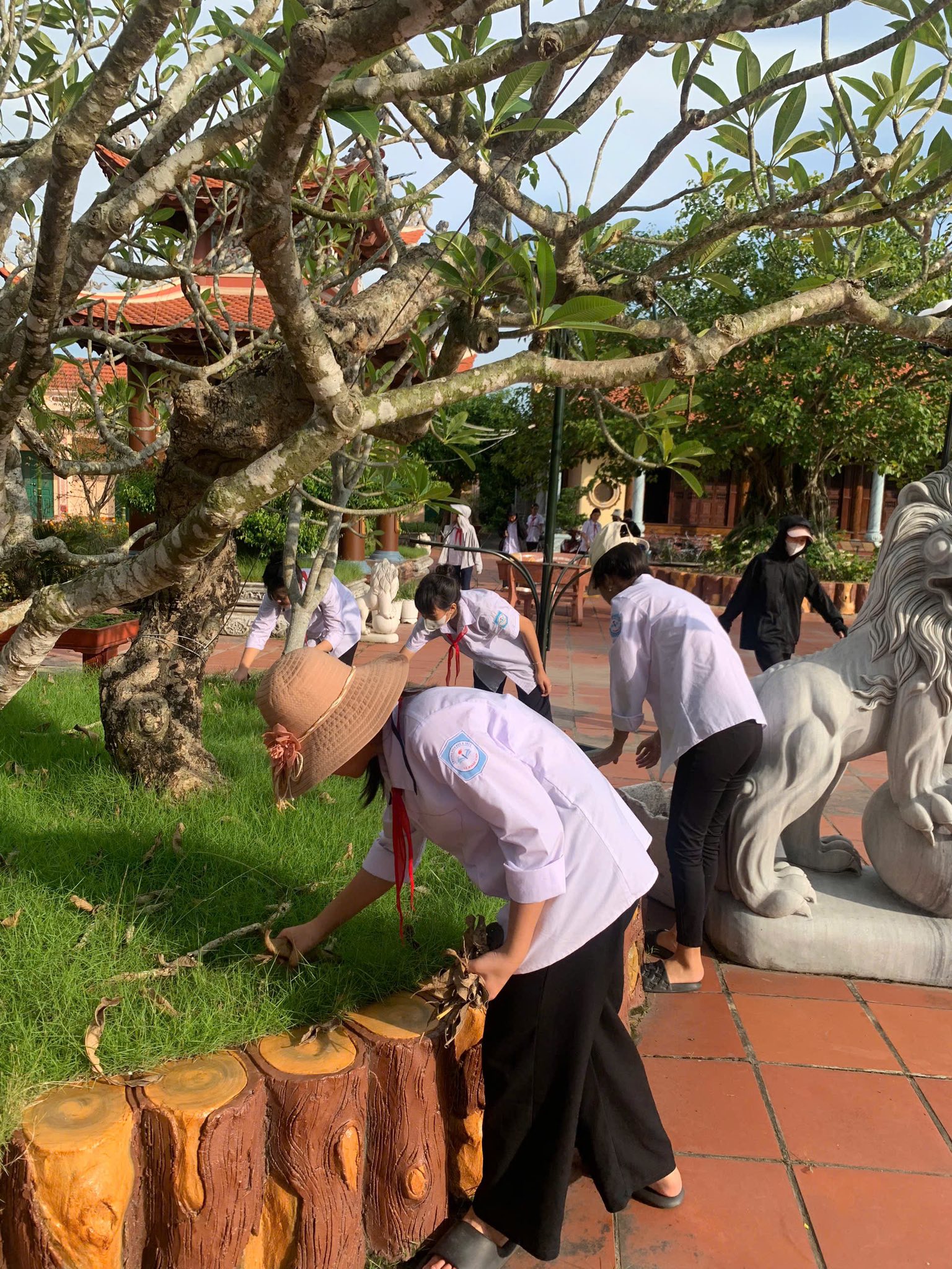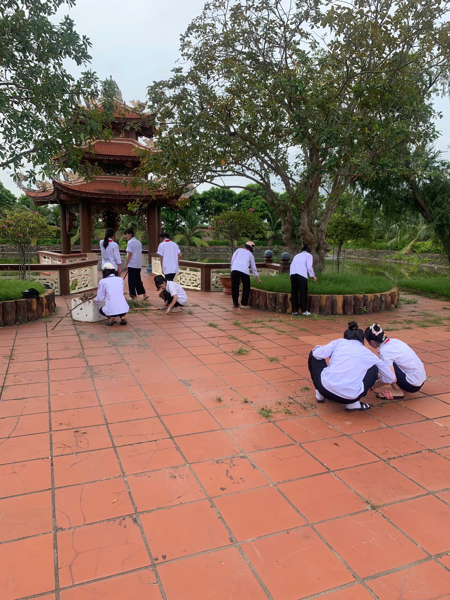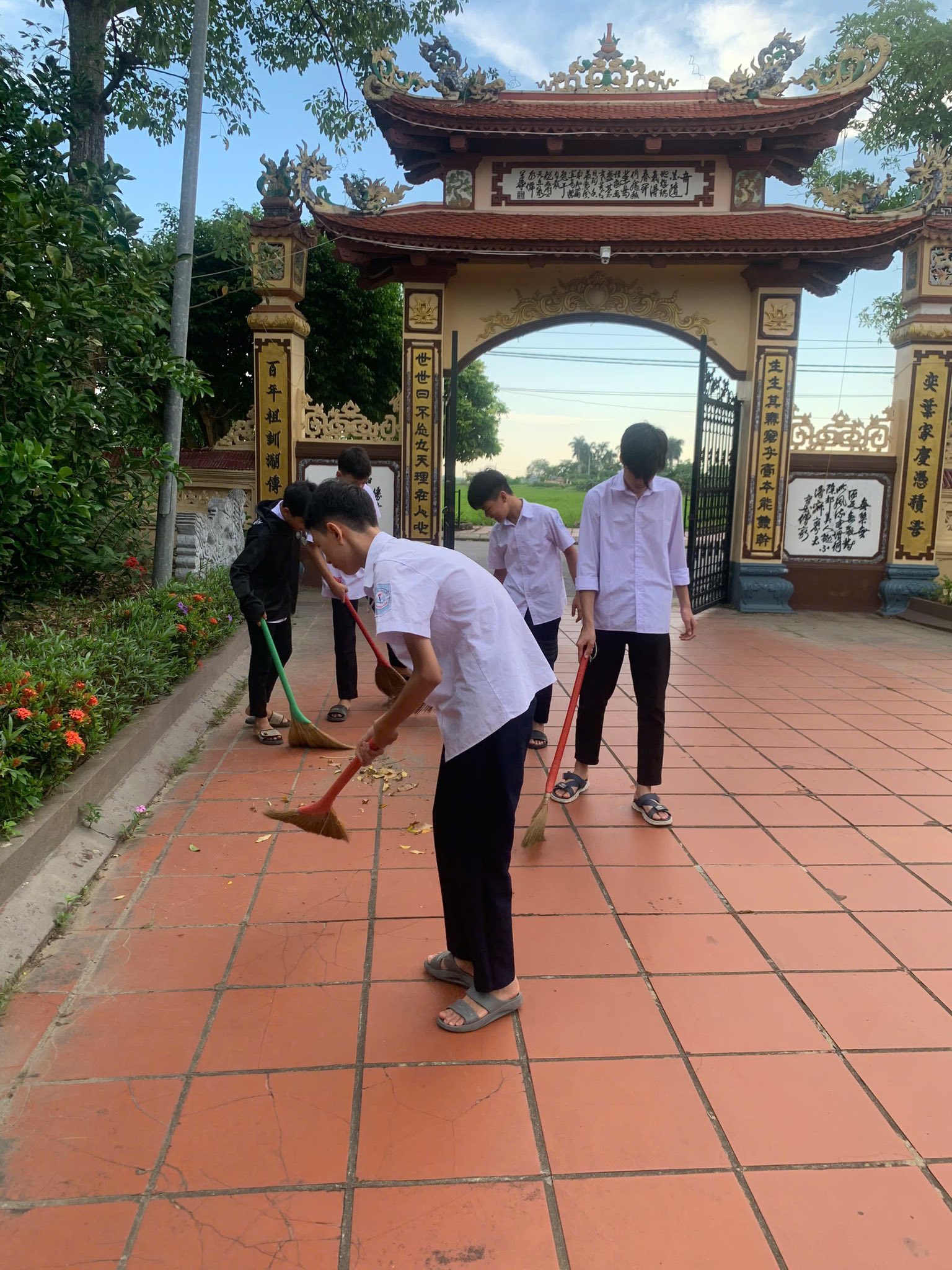 Dưới sự hướng dẫn của cô giáo chủ nhiệm cùng các thầy cô trong nhà trường, các em học sinh đã tích cực tham gia các hoạt động như quét dọn, nhổ cỏ, chăm sóc cây xanh, vệ sinh sân đền, ngõ vào và thu gom rác thải trong khuôn viên di tích.