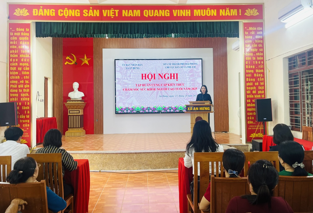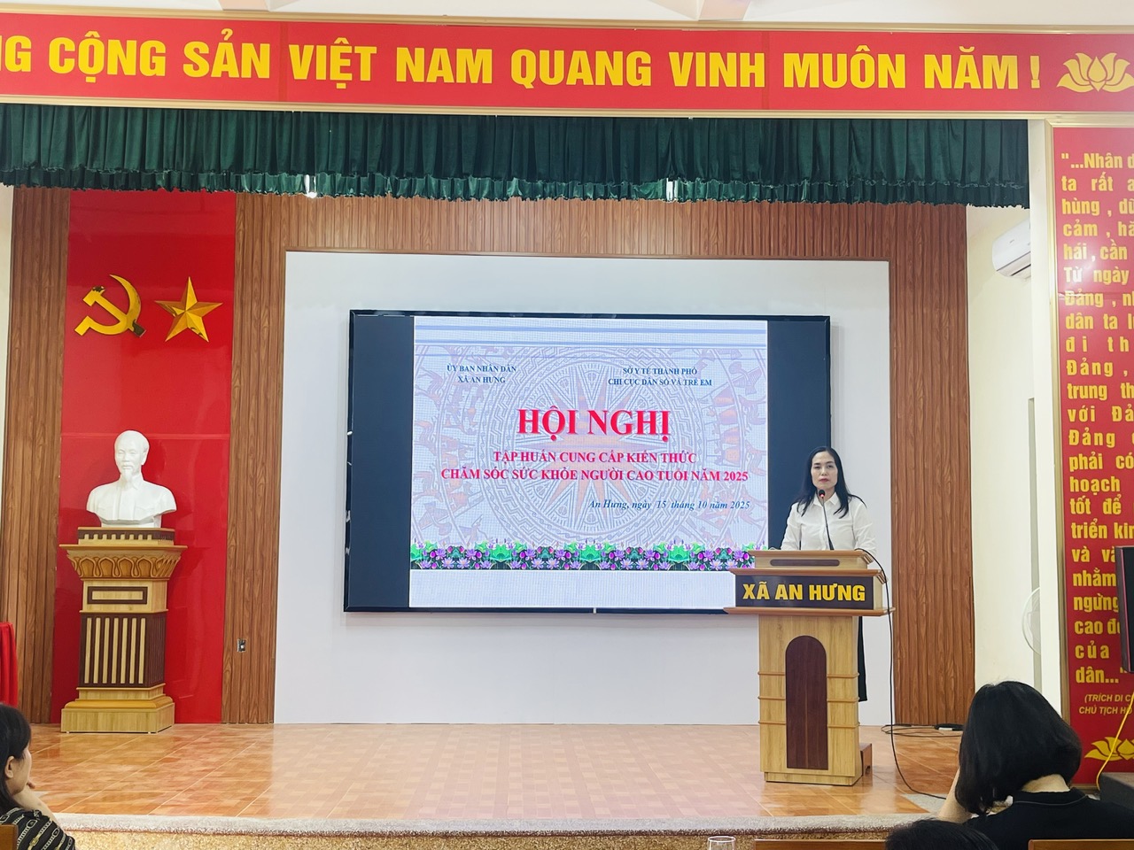 Thực hiện Kế hoạch số 34/KH-CCDSTE ngày 06/10/2025 của Chi cục Dân số và Trẻ em về việc tổ chức tập huấn, cung cấp kiến thức về chăm sóc sức khỏe người cao tuổi năm 2025. Sáng ngày 15/10/2025 Ủy ban nhân dân xã An Hưng phối hợp cùng Chi cục Dân số và trẻ em thành phố; Trung tâm y tế khu vực An Lão tổ chức Hội nghị tập huấn cung cấp kiến thức về chăm sóc sức khỏe người cao tuổi năm 2025.