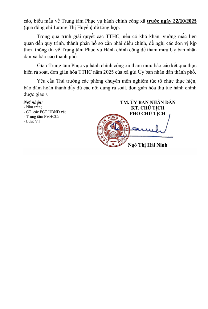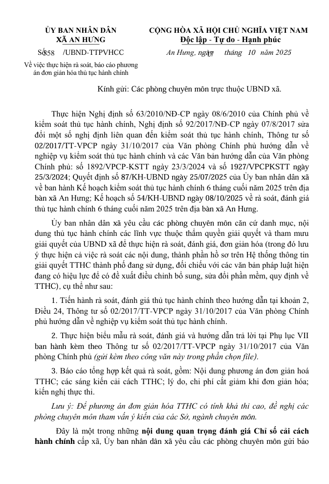 Công văn số: 558/UBND-TTPVHCC 17 tháng 10 năm 2025 của Ủy ban nhân dân xã An về việc thực hiện rà soát, báo cáo phương án đơn giản hóa thủ tục hành chính