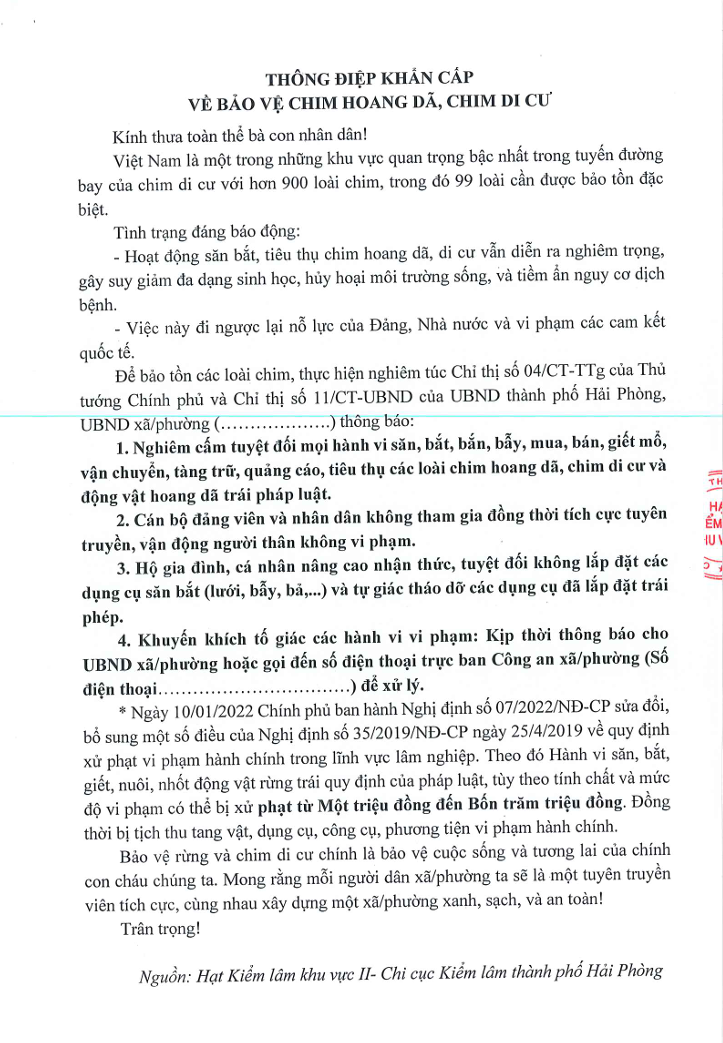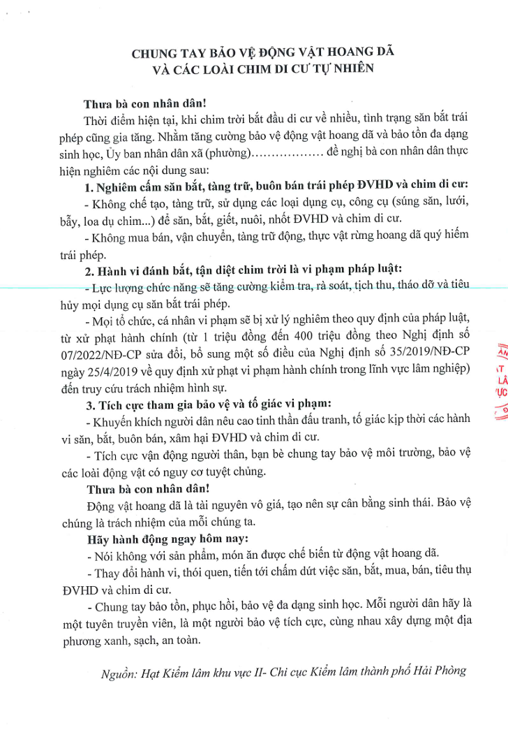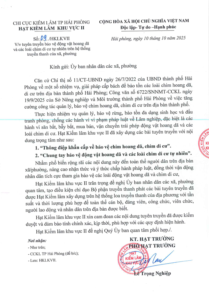 Công văn số: 09/HKLKVII ngày 10 tháng 10 năm 2025 của Hạt Kiểm lâm Khu vực II- Chi cục Kiểm lâm thành phố Hải Phòng về việc tuyên truyền bảo vệ động vật hoang dã và các loài chi di cư tự nhiên trên hệ thống truyền thanh của xã, phường