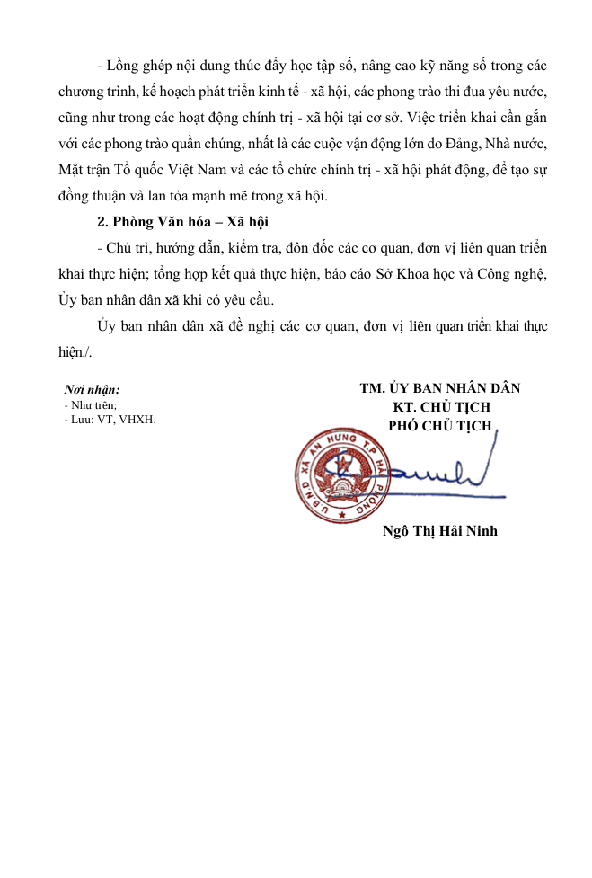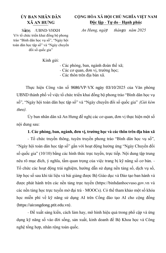 Công văn số: 496/UBND-VHXH ngày 7 tháng 10 năm 2025 của Ủy ban nhân dân xã An Hưng về việc tổ chức triển khai đồng bộ phong trào “Bình dân học vụ số”, “Ngày hội toàn dân học tập số” và “Ngày chuyển đổi số quốc gia”.