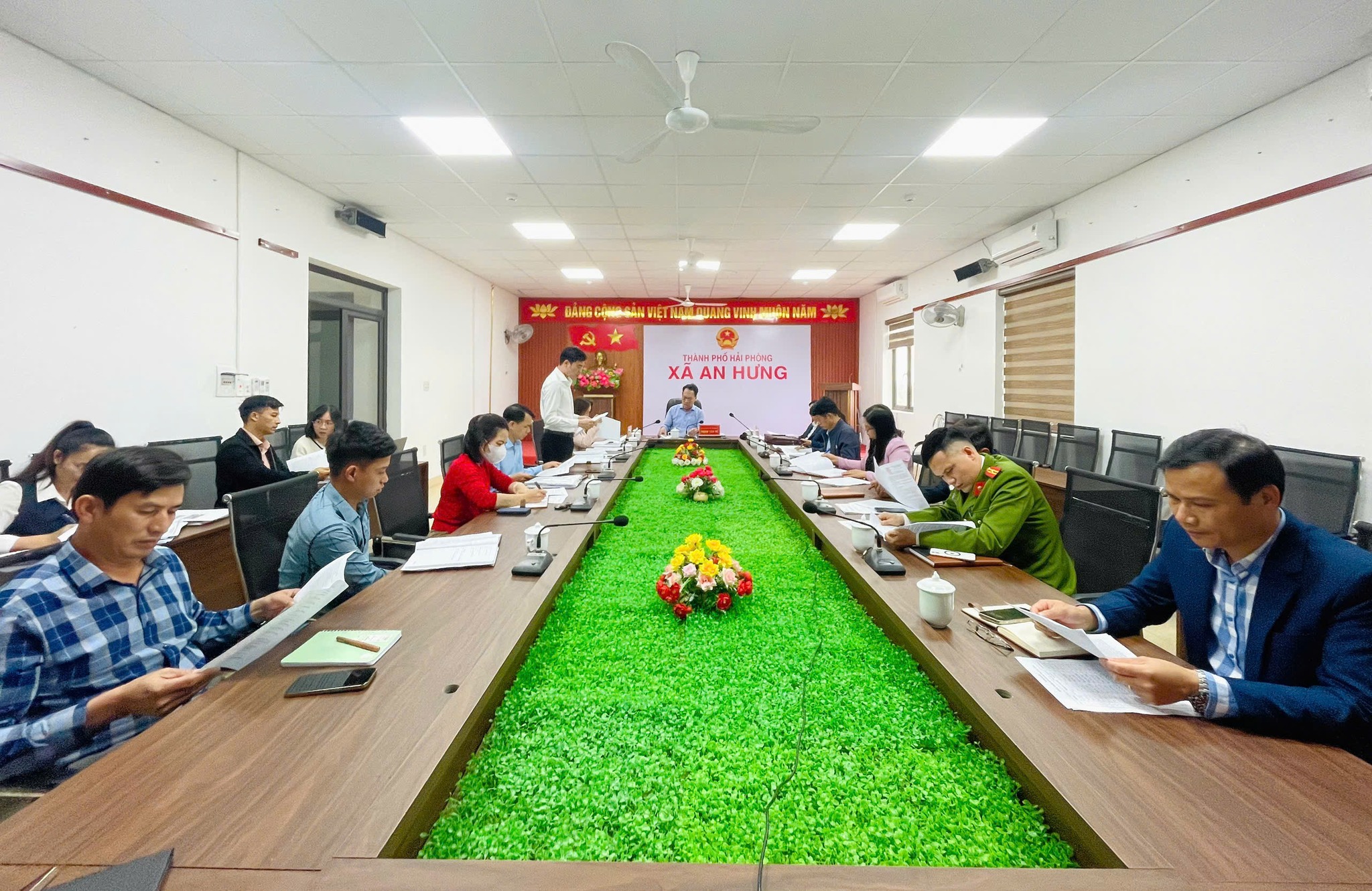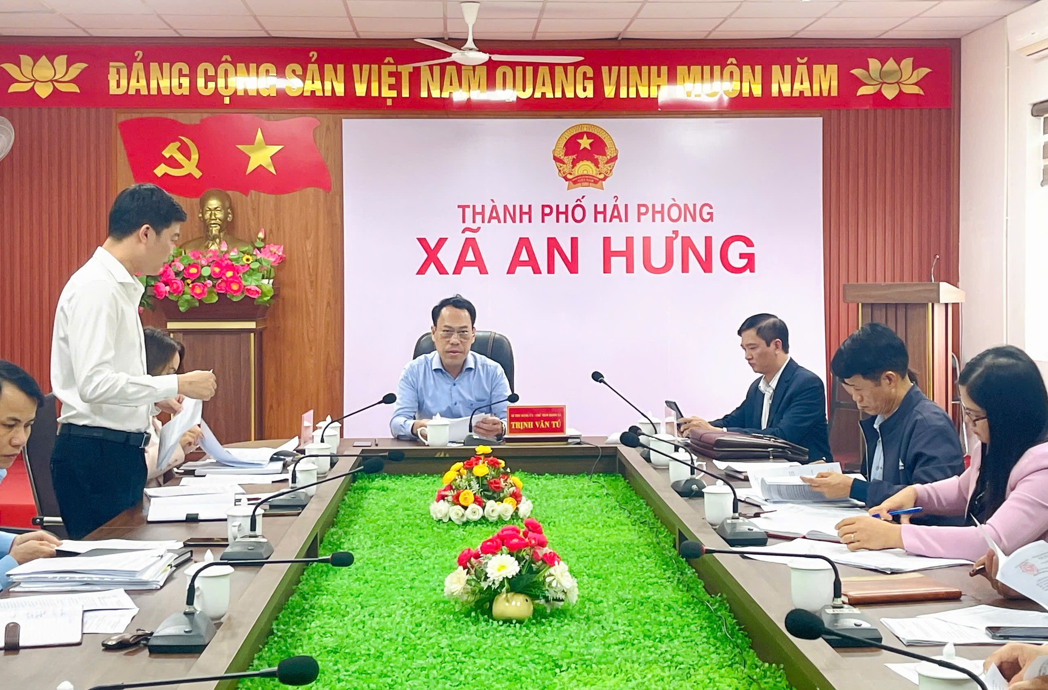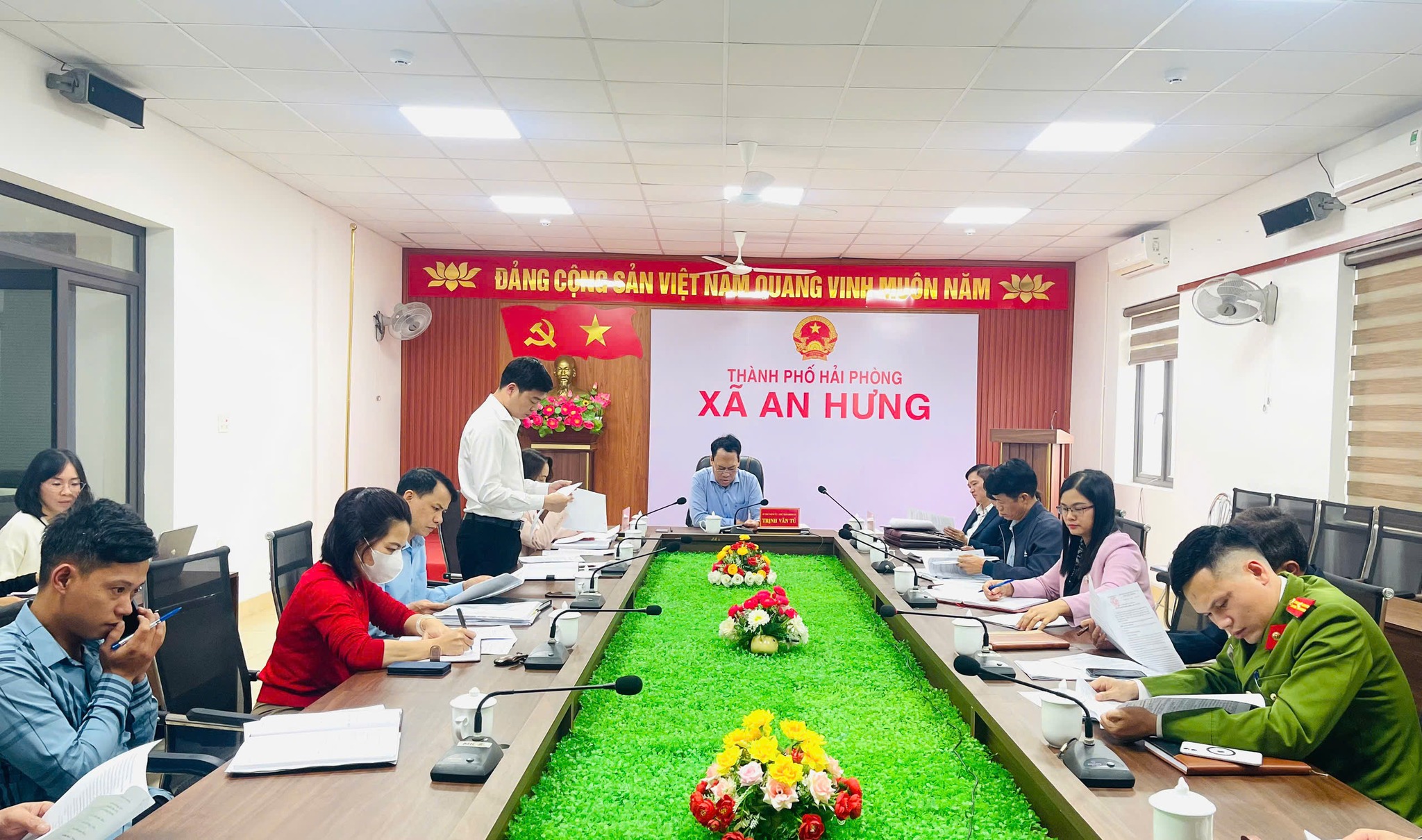 Dự và chủ trì hội nghị có đồng chí Trịnh Văn Tú – Bí thư Đảng ủy, Chủ tịch HĐND xã; tham dự hội nghị có đồng chí Hàn Ngọc Trang– Phó Bí thư Thường trực Đảng uỷ xã; đồng chí Nguyễn Đức Trung – Phó Bí thư Đảng ủy, Chủ tịch UBND xã; cùng các đồng chí Ủy viên Ban Thường vụ, Phó Chủ tịch UBND xã; Thủ trưởng các phòng, đơn vị: Kinh tế, Văn hóa – Xã hội, Văn phòng HĐND & UBND, Trung tâm Phục vụ hành chính công, Trung tâm Dịch vụ sự nghiệp công, Công an xã, Ban Chỉ huy Quân sự xã; cùng lãnh đạo, chuyên viên Văn phòng Đảng ủy.