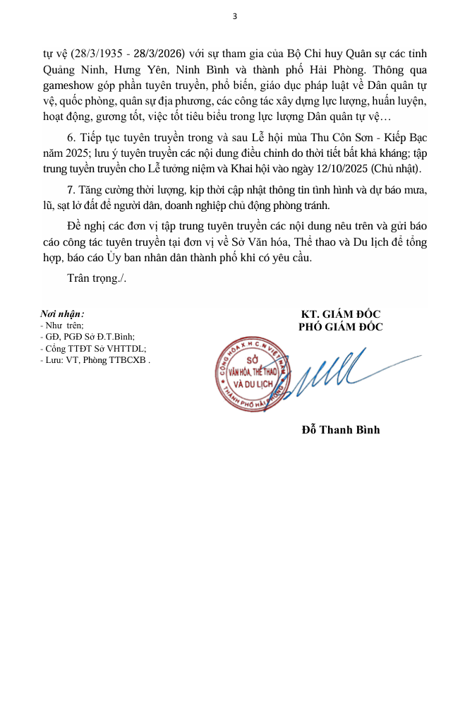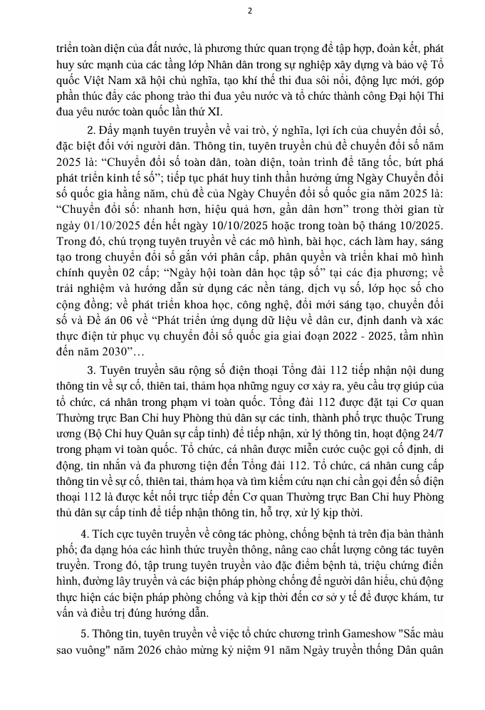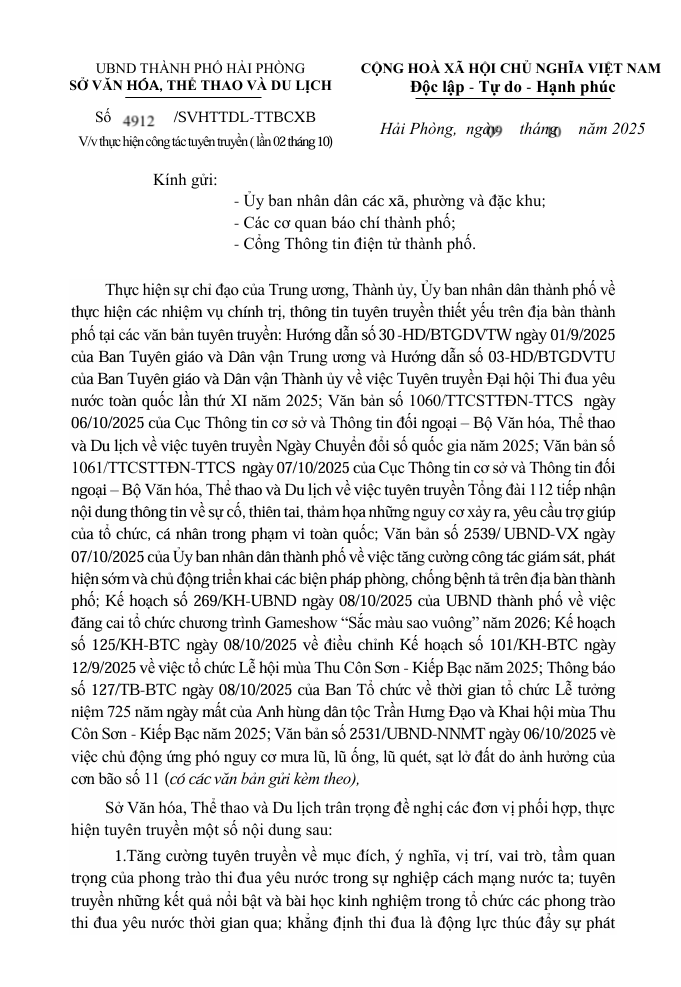 Kế hoạch số: 4912/SVHTTDL-TTBCXB ngày 9 tháng 10 năm 2025 của Sở Văn hóa, Thể thao và Du lịch về việc thực hiện công tác tuyên truyền( lần 02 tháng 10)