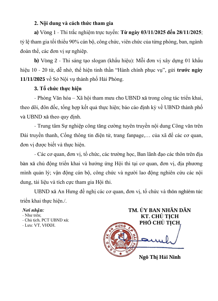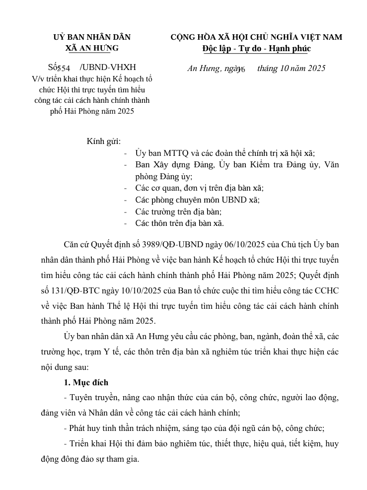 Kế hoạch số 554: /UBND-VHXH ngày 16 tháng 10 năm 2025 của Ủy ban nhân dân xã An Hưng về việc triển khai thực hiện Kế hoạch tổ chức Hội thi trực tuyến tìm hiểu công tác cải cách hành chính thành phố Hải Phòng năm 2025