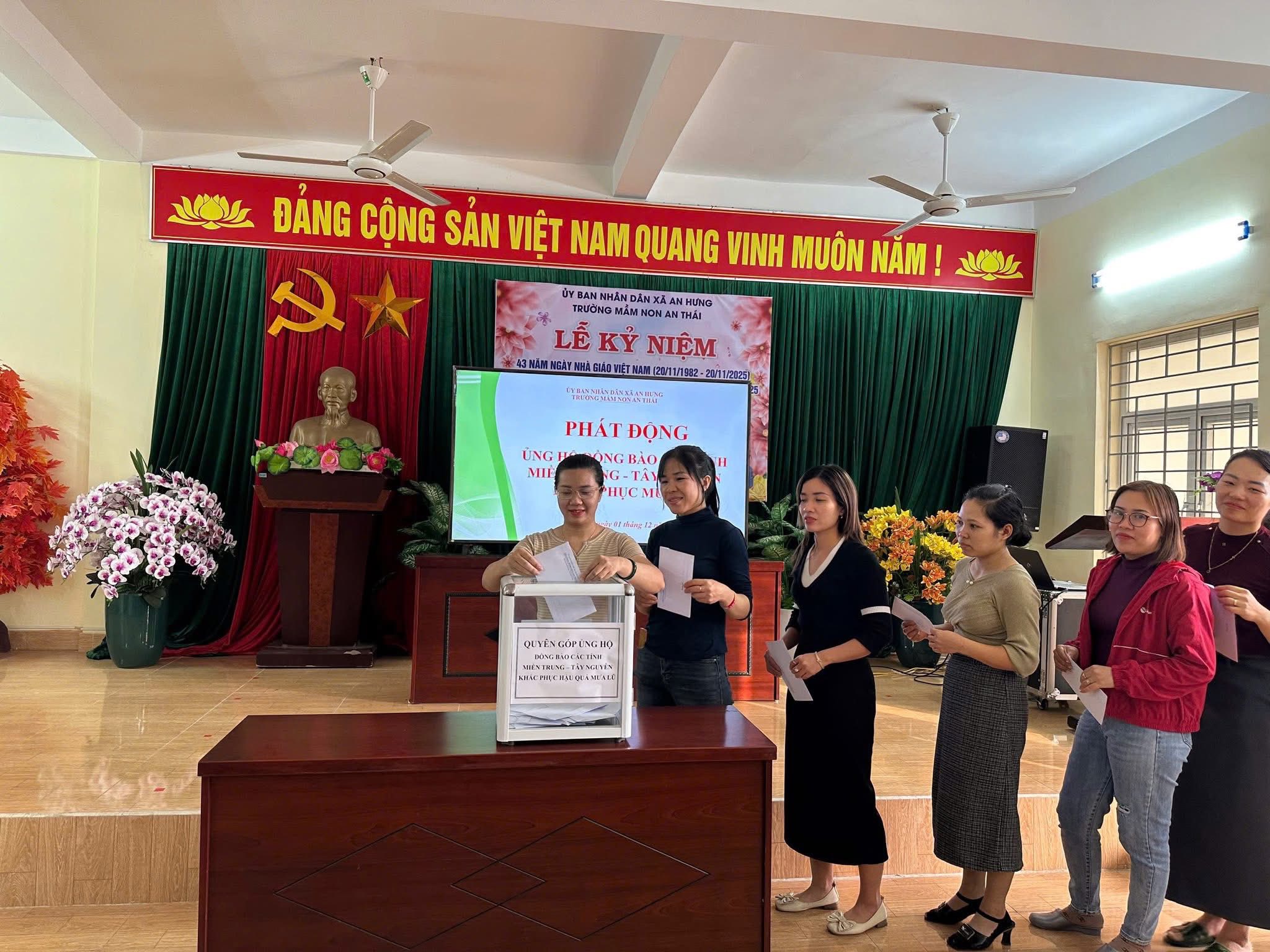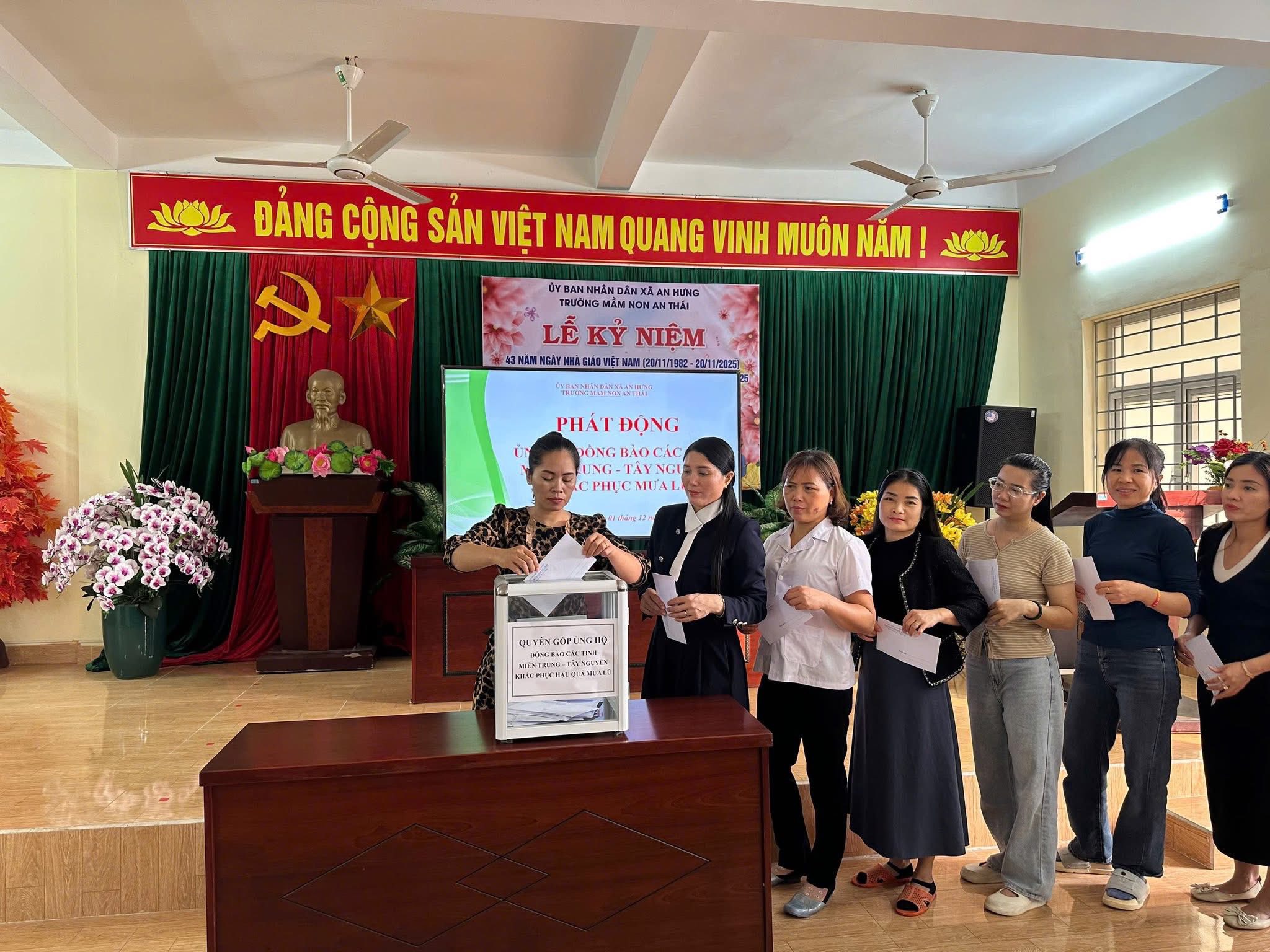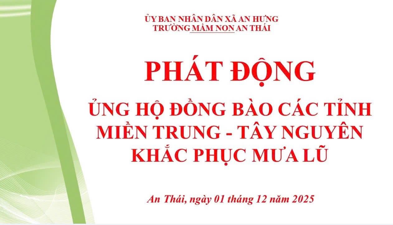 Hưởng ứng lời kêu gọi của Ủy ban MTTQ Việt Nam xã An Hưng về việc hỗ trợ đồng bào Miền Trung – Tây Nguyên khắc phục hậu quả sau mưa lũ, sáng ngày 01/12/2025, Trường mầm non An Thái tổ chức Chương trình phát động phong trào quyên góp ủng hộ trong toàn thể cán bộ, giáo viên, nhân viên và học sinh nhà trường.